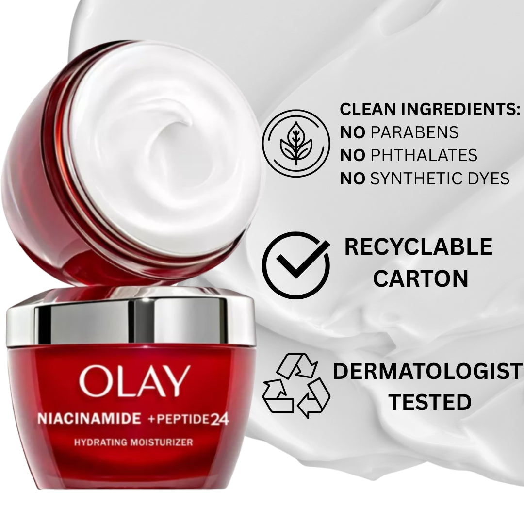 Message Us to OrderOlay Regenerist Niacinamide + Peptide 24 Hydrating Face Moisturizer. Renew your skin's natural glow with Olay Regenerist Niacinamide + Peptide 24 Hydrating Face Moisturizer, Olay's most hydrating moisturizer. Inflused with Olay's Vitamin B3 (Niacinamide) + Peptides, its moisture-binding formula penetrates up to 10 layers deep into skin surface & helps optimize surface cell renewal. It strongly hydrates skin for 24 hours, visibly renews & firms skin.